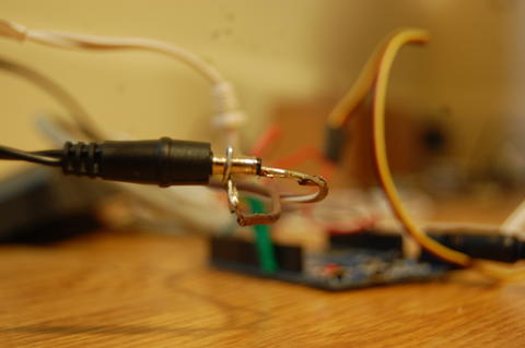 I also polished up the wiring. I'd been running the HID reader off of a wall wart, with a jack made of electrical tape. The Arduino, meanwhile, was depending on a computer for life support. I used a coin cell and LED as a continuity tester to wire the Arduino up the right way to the wall wart (we don't have a multimeter), and fixed up the connecting jack for better (if not good) reliability.