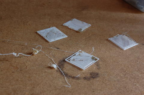The first bed level test was all right, but the filament kept sticking to the print head and peeling up. On the second and third tries, there wasn't enough space between the head and the bed: the filament was blocked from coming out.