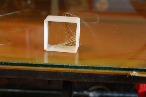 Next in the calibration sequence: infill! Infill describes the stuff that the printer puts inside the print to hold it together. If there's too much, prints will bulge in the middle. Too little and flat tops will become concave. The test pattern is a tall tower, and will take some time to print. The tower looks reasonable on the left and front sides of the printer, but the back-right corner has excess plastic all over it. The extruder seems to be leaking from the top, and spilling onto the print.
