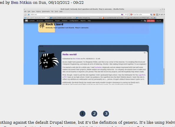 Update 3: It's amazing how powerful CSS is. I just themed a simple pager into something pretty. It started off as the text 123, with each number linking to an image. Now, the text is centered, surrounded by a bubble, and indicates which image is being shown! (image 3)