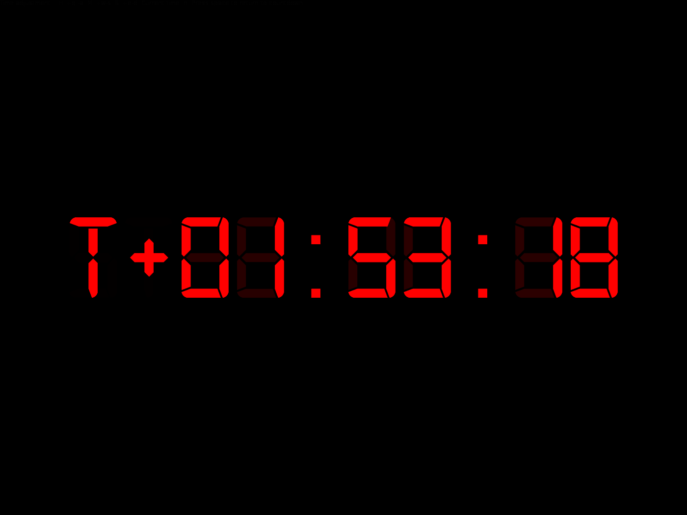 That's as far as I got last night. Today, I substantially rewrote the code to add more features. It now handles both positive and negative times, switching from T-xx:xx:xx to T+xx:xx:xx at launch time. It's using a digital font now, complete with a background overlay of 88:88:88. There's also a bit of fading as the numbers change, and target time can be changed on-the-fly. It's also set to roll over daily: the timer always reports between T-12 and T+12 hours. That way, a countdown to the wee hours of the morning doesn't report T+23.