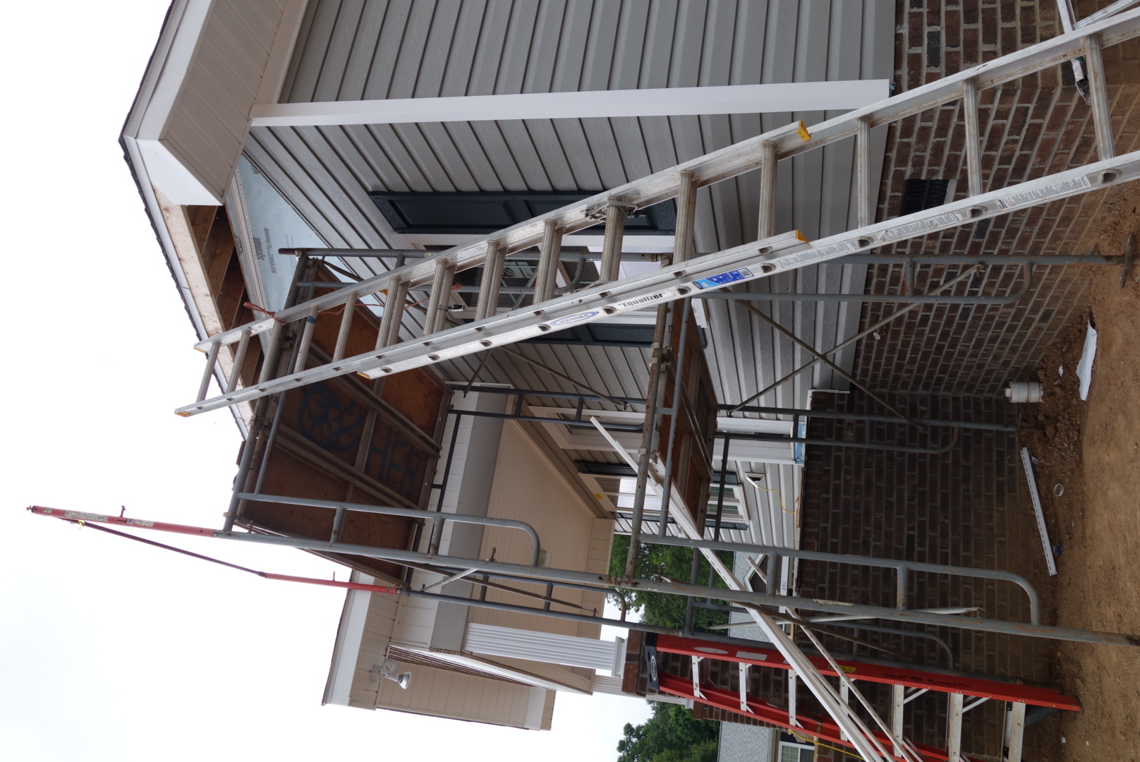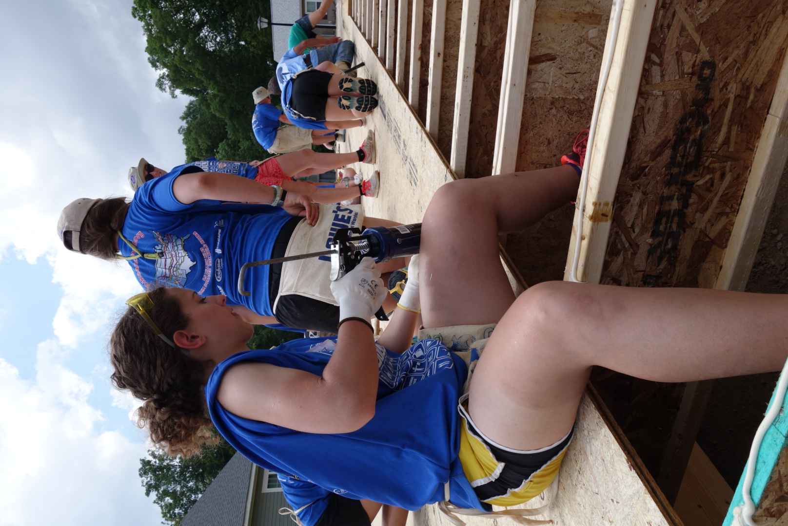 I worked on siding the top of a houses front wall. Others installed subfloors or painted. Helen made a bus stop.