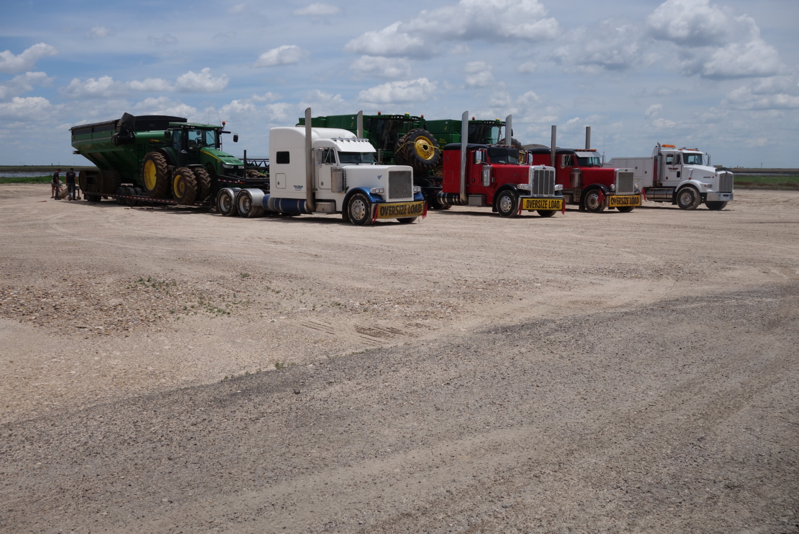 An armada of tractor trailers carrying oversize loads of tractors and combines.