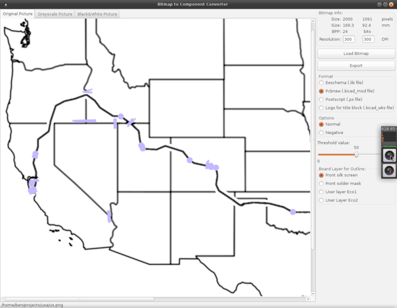 Start by opening Bitmap2Component. From the main KiCad window, it's the icon to the side here. That'll open the program shown below. You can follow the usual way of creating a component: click on Load Bitmap, adjust the threshold value to select which parts are in the component file, and so on. The Black&White tab shows the final outline. For copper, try to use a resolution above 300dpi (600 or 1200 is best); modern processes can create really, really small features, and you want to take advantage of that. When you're done, save it as a Pcbnew file (.kicad_mod). It doesn't much matter which layer you use, but I'll pretend you're using the Front Silk Screen layer.