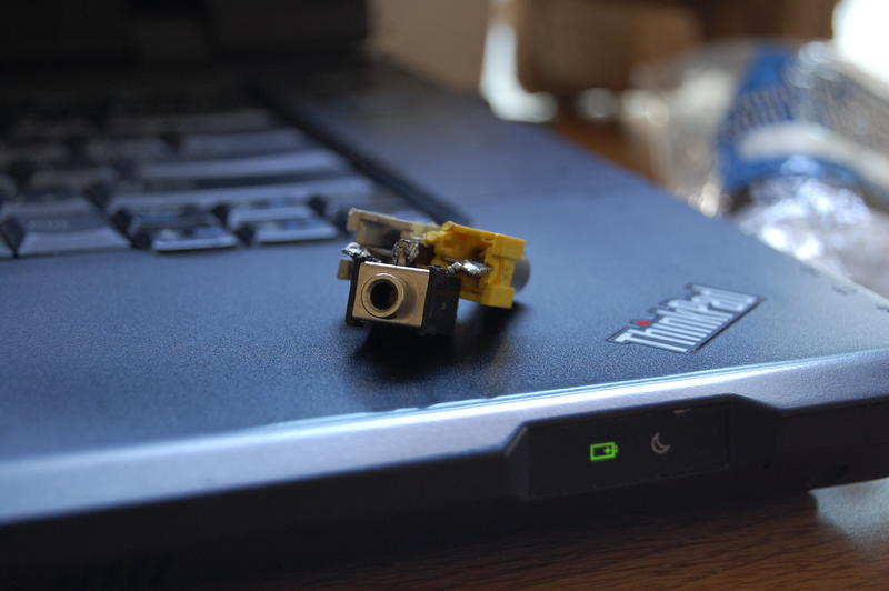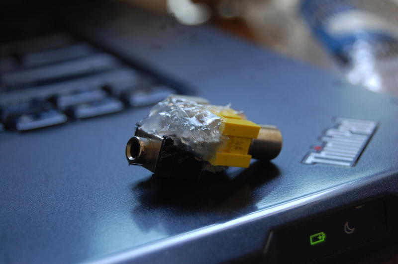 My dad found me some solder in the basement, but I was reticent to use it without testing. I made an adapter that connects a computer to a stereo to test the solder (and to use).