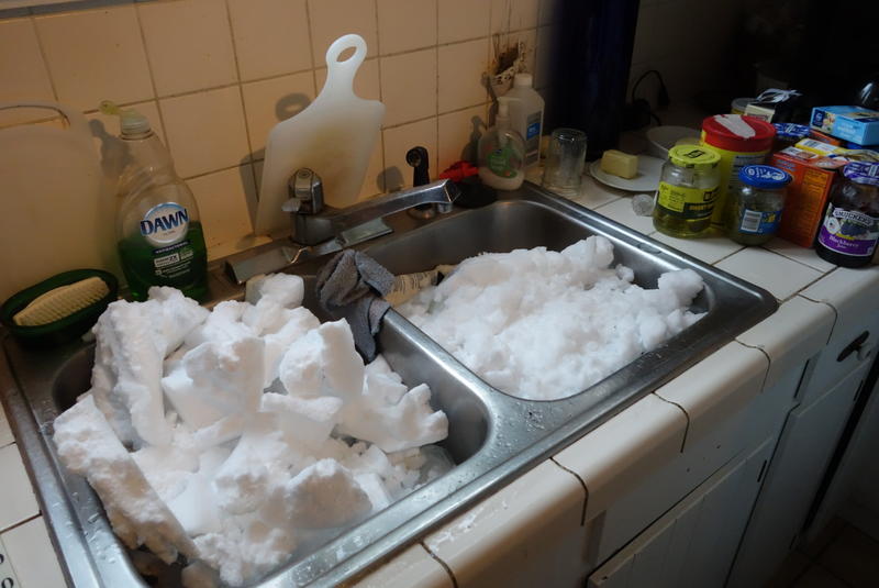 The next morning, we slept in. Helen read a book while I worked on the broken refrigerator. After taking the whole thing apart, defrosting everything, and checking the defrost timer, I found infinite resistance across the heater coils. Infinite resistance means no heat.