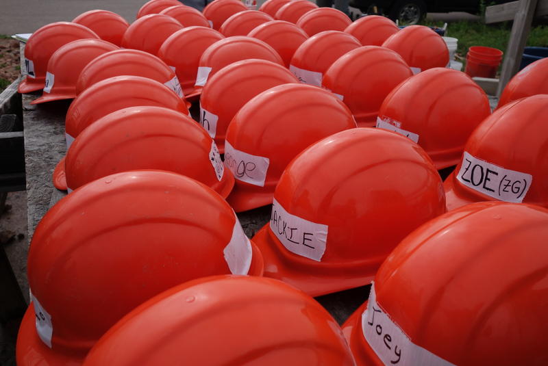 Habitat says out our hard hats in the morning. The front of each has our name, and the backs have a picture that describes us. A doodle, really.