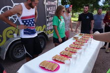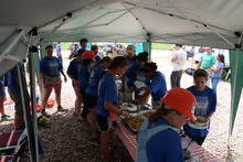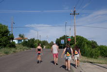 We started the day with a very patriotic van: overnight, a few riders filled the van to the brim with red, white, and blue balloons. When the leaders found out, they made us clean the thing out (after laughing quite heartily). Watching 20-somethings running around with pointy things trying to burst balloons wandering off in the morning breeze is ... something.