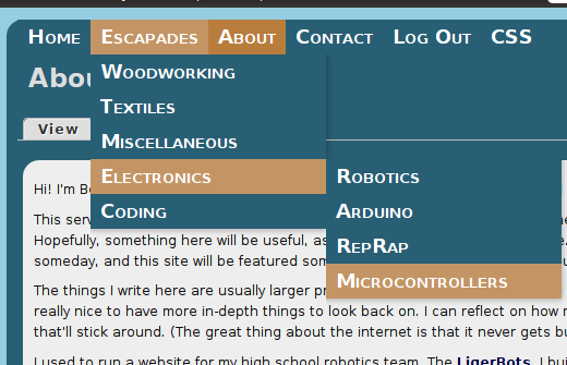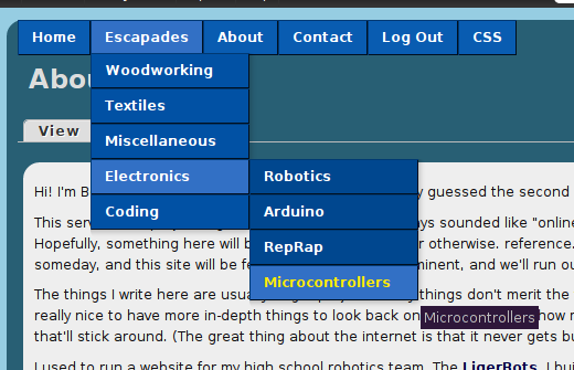 When I set this site up, I wanted dropdowns. Y'know, menus that expand when you hover them. They were initially provided by Nice Menus. For some reason, some time later (and no, I don't know why), Nice Menus stopped being nice. The dropdown's wouldn't drop.