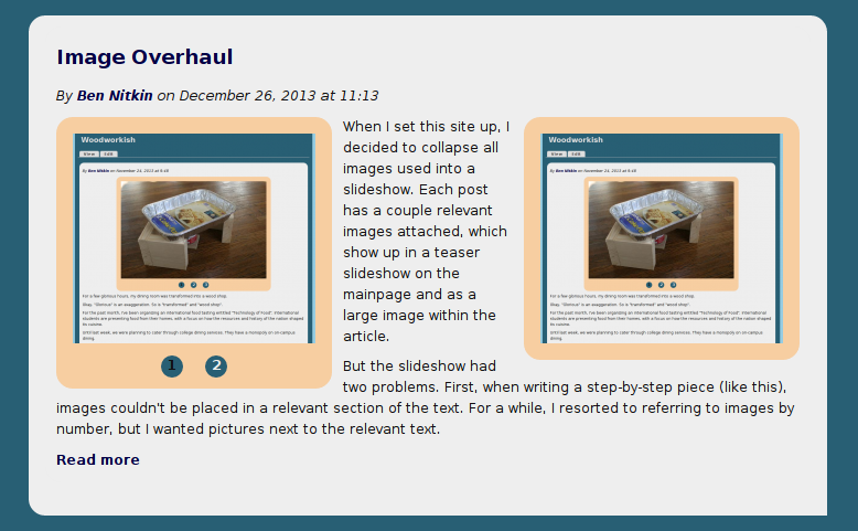 But the slideshow had two problems. First, when writing a step-by-step piece (like this), images couldn't be placed in a relevant section of the text. For a while, I resorted to referring to images by number, but I wanted pictures next to the relevant text.