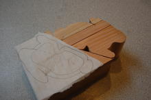 The pattern we found built a very cute bunny box. We started with a 4x6x10" piece of pine (well, actually a 2x4 laminated onto a 4x4.) With careful alignment, we found that there was enough wood to make two matching boxes.