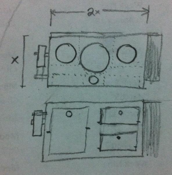 The creature is taking shape!The first day of construction left me with a set of planks. Two sides, a back, and a queer-looking front. The front has a few pivoting drawers: pressing on the bottom of the drawer will swing the top forward and out. Since the drawers push to open, no handles are needed, so the front can be perfectly flat. It looks slick (see illustration 1).