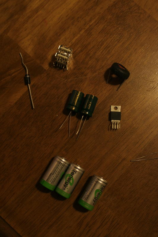 The first etch wasn't a complete waste of copper, though. I found that my inductor footprint was twice the size it should have been (diameter != radius) and that the regulator's feedback was mistakenly connected to the switching supply, rather than the stabilized voltage by the capacitor. With that in mind, I trashed my original revision of the printed board and drafted one half the size. (The original had a lot of empty space.) I'm going to try etching again later today.
