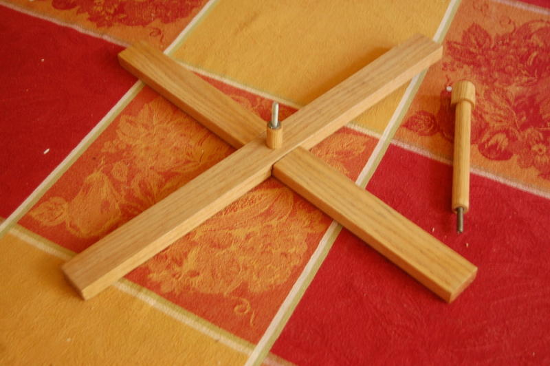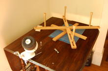 My mom asked me to make her a yarn swift, which is a sort of lazy susan for a skein of yarn. Often, yarn comes in skeins (loops) that become hopelessly bunched as they unwind. A ball of yarn is easier to knit with, and she has a small machine that'll wind yarn into a ball. The swift holds the yarn as it unwinds, preventing tangles.