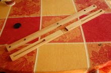 We decided to use both fixed pegs (seated in holes) and mobile pegs (seated in channels) to hold the skein of yarn. The holes were incredibly easy: I drilled a 5/8" hole to a depth of 3/8" near the end of each arm. I swapped to a ¼" drillbit and drilled the rest of the way through.
